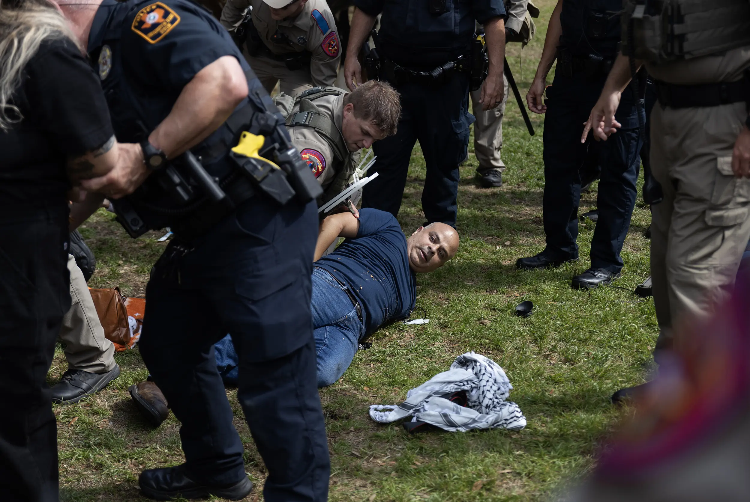 사진/ 텍사스 트리뷴 (Carlos, a FOX 7 photojournalist, lays on the ground as he is arrested while covering a pro-Palestinian demonstration at the University of Texas at Austin on April 24, 2024. Credit: Julius Shieh for The Texas Tribune)