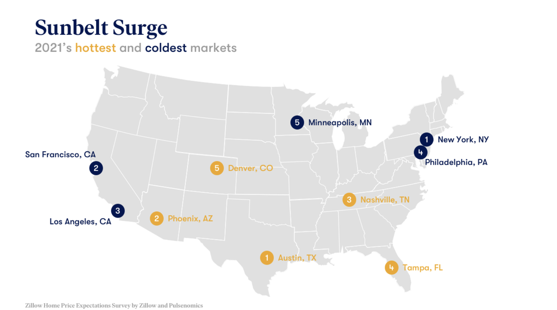 질로우가 부동산 전문가들을 대상으로 한 설문조사에서 주택가치 상승폭이 가장 낮은 지역에 뉴욕과 샌프란시스코가 예측됐으며 가장 높은 상승을 보일 것으로 기대된 도시는 오스틴이었다.
