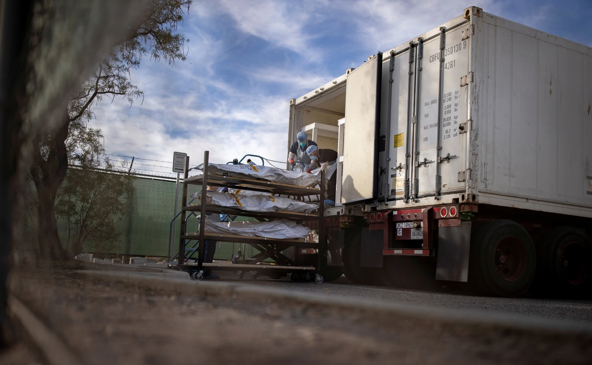 사진/ NBC 뉴스 (El Paso County Medical Examiner’s Office staff members help move bodies in bags labeled “Covid” from refrigerated trailers on Nov. 23.)