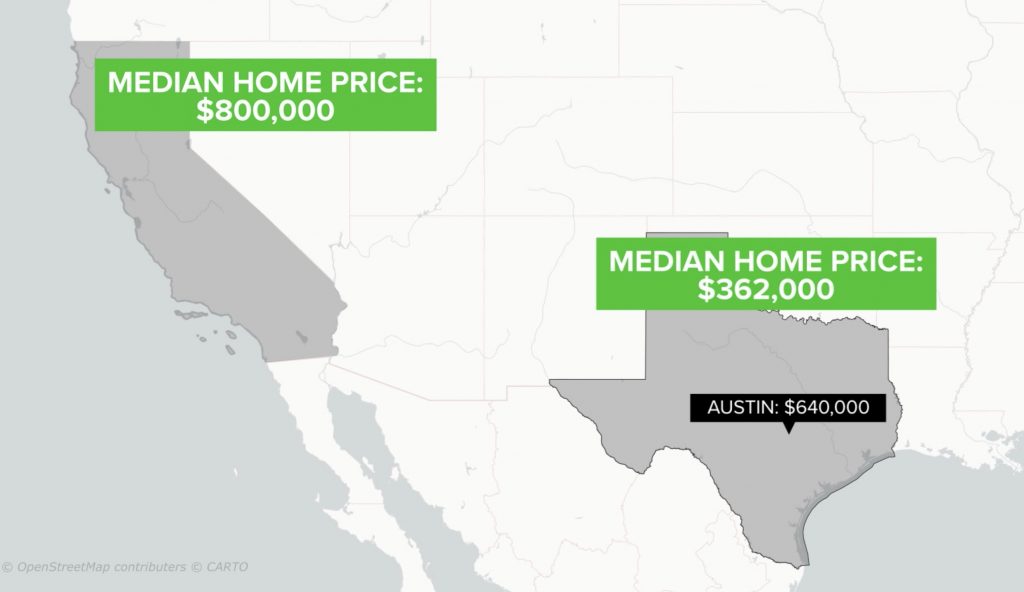 실제로 캘리포니아에서 집을 매매하고 텍사스에서 같은 크기의 주택을 훨씬 저렴하게 구입할 수 있다. 텍사스에서 주택가격이 가장 많이 오른 오스틴의 경우 주택매매 중간가격이 무려 64만달러까지 치솟았지만 텍사스 전체로 볼때는 36만 2,000달러다. 하지만 캘리포니아의 주택매매 중간값이 80만 달러이며 샌프란시스코의 경우 무려 130만 달러까지 올랐다.