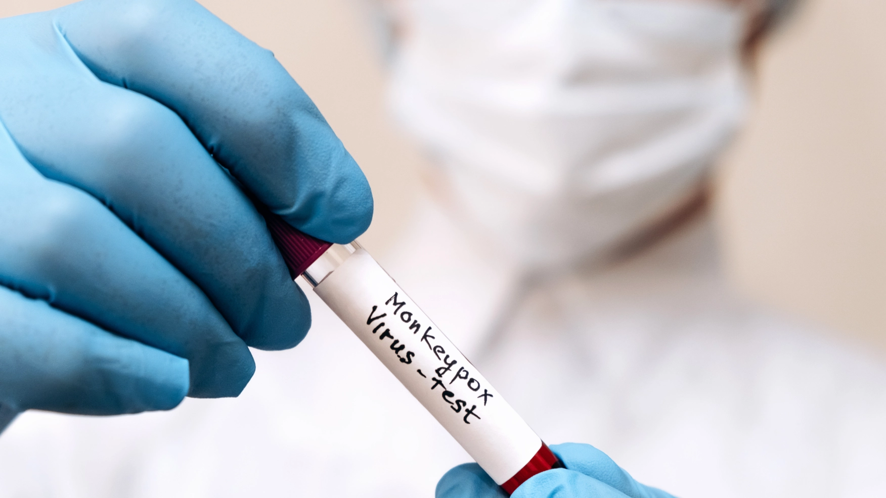 사진/ NBC (A medical worker holds a test tube with Monkeypox virus infected blood sample in his hands,hands in gloves close-up.Epidemic of smallpox monkeys in Europe and the USA.)