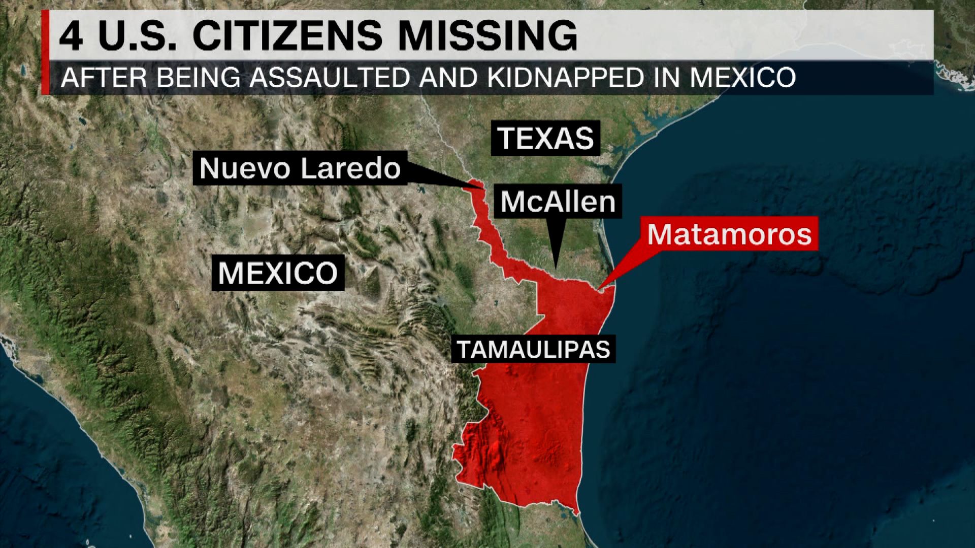 AP와 CNN에 따르면 미국인 4명인 지난 3일(금) 텍사스와 멕시코 접경지인 브라운즈빌에서 멕시코 마타모로스로 입국했다. 이들은 노스캐롤라이나 번호판이 달린 흰색 미니밴을 타고 여행중에 괴한에게 납치됐다.