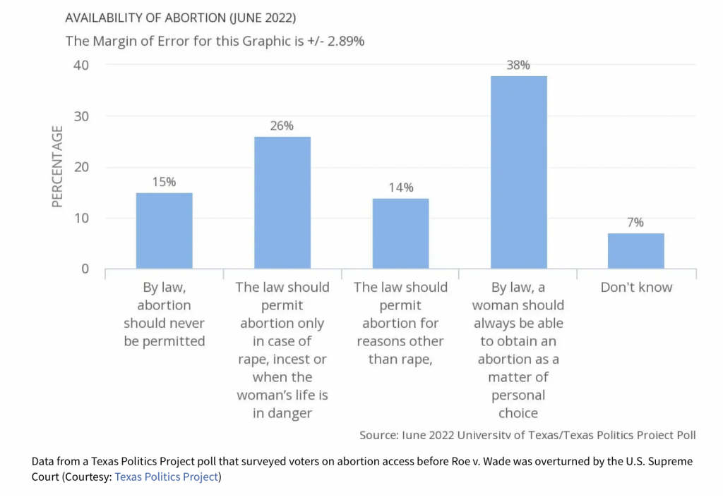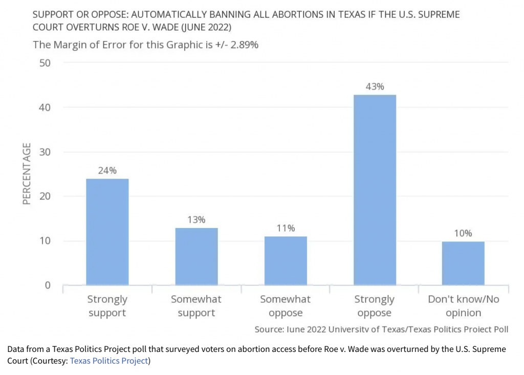 연방대법원의 낙태권 폐기 이전 실시한 “낙태권 폐기시 텍사스에서 자동으로 금지되는 것에 찬성하는가”라는 질문에 응답자의 43%가 낙태 자동금지에 대해 강력하게 반대한다고 답했고 24%는 강하게 지지한다고 답했다.