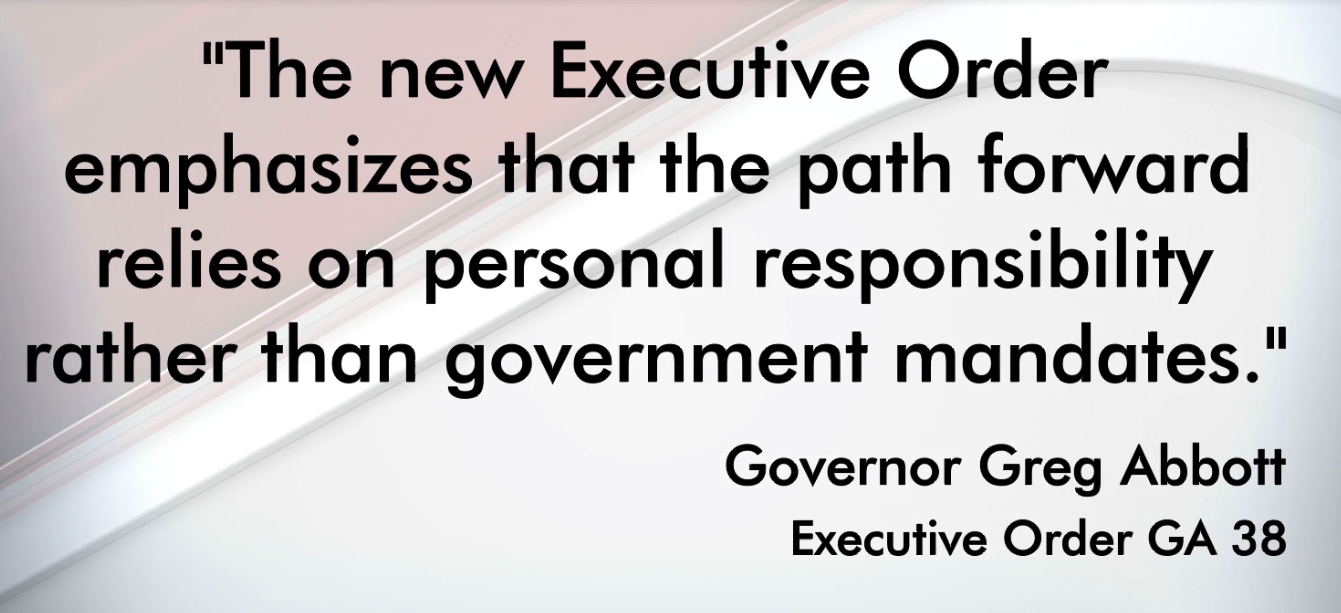 텍사스 주정부의 행정명령에 따라 정부기관 및 교육구는 마스크 착용을 의무화 할 수 없게 됐다. 또 예방접종을 강권할 수 없을 뿐만 아니라 예방접종 증명서를 요구할 수 없다. 또 공무원들에게도 마스크 착용을 강제하지 못한다.