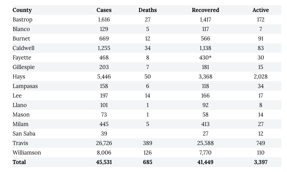 센트럴 텍사스 15개 카운티 합계 누적 확진자 수가 9월 3일 현재 45만 531명으로 이가운데 685명이 사망했고 41만 449명이 완치됐다. 또 코로나 바이러스 감염으로 인한 병원치료를 받고 있는 환자수는 3,397명으로 집계됐다. 어스틴의 트레비스 카운티가 가장 많은 누적환자수인 26만 726명을 기록했고 이가운데 25만 588명은 완치, 749명은 현재 병원치료를 받고 있다. 두번째로 많은 누적확진환자는 윌리엄슨 카운티로 총 8,006명의 누적확진환자수를 보였으나 현재는 대다수 치료가 완료, 현재는 110명이 병원치료를 받고 있다.