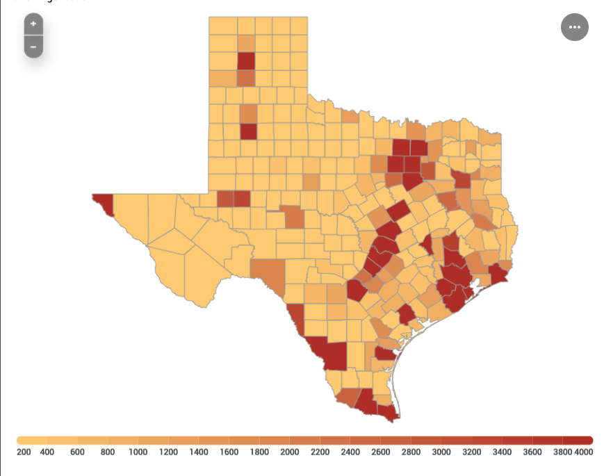 휴스턴의 해리스 카운티가  10만 8,085명으로 텍사스 주 전체에서 가장 많은 코로나 확진 환자수를 기록했다.  이어 매버릭 카운티, 무어 카운티, 비 카운티, 카메론 카운티가 거주인구 대비 많은 확진자가 발생한 것으로 집계됐다.