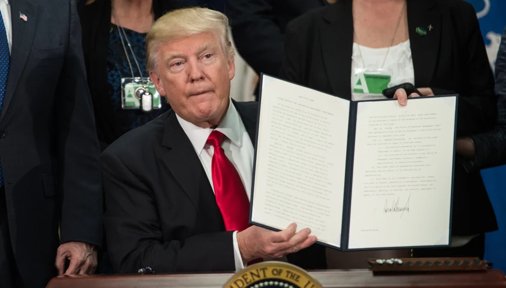 사진/ NBC (President Donald Trump holds up an executive order to start the Mexico border wall project at the Department of Homeland Security facility in Washington on Jan. 25.Nicholas Kamm / AFP – Getty Images)