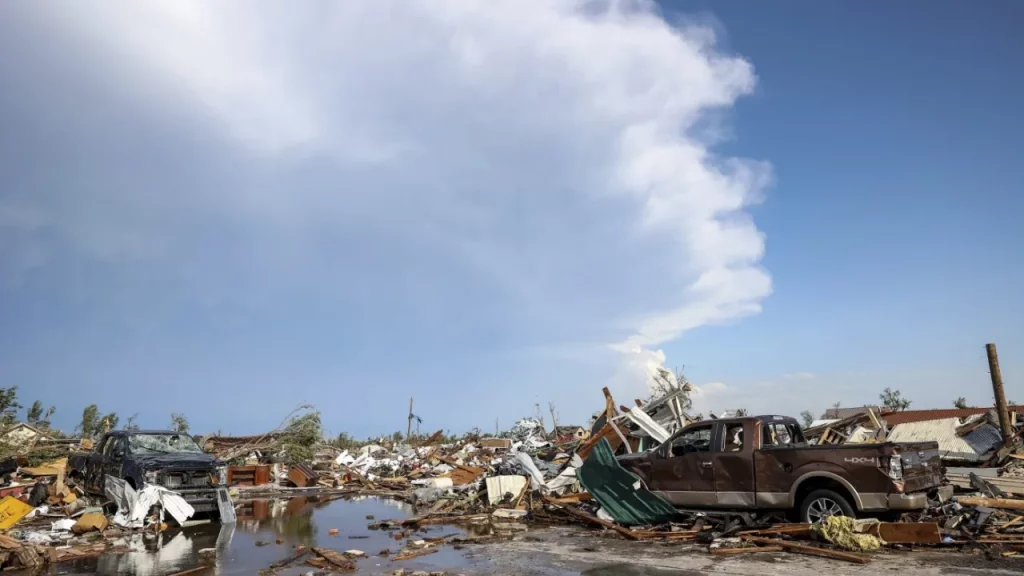 사진/ 더 힐 (Damaged pickup trucks sit among debris after a tornado passed through a residential area in Perryton, Texas, Thursday, June 15, 2023. (AP Photo/David Erickson)