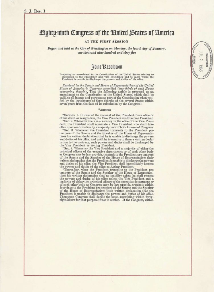수정헌법 25조는 미국 헌법 제2조 제1항과 제6항에서 대통령이 공석이 되는 경우 ‘해당직무는 부통령에게 귀속한다’는 애매한 표현 때문에 수정된 법안이다.