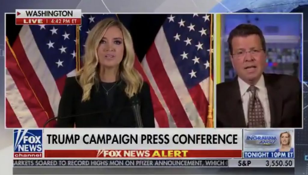 폭스뉴스(Fox News)가 케일리 매커내니(Kayleigh McEnany) 백악관 대변인 기자회견을 생중계하다 1분여만에 방송을 중단했다. 매커내니 대변인은 9일(월) 워싱턴DC 공화당 전국위원회(RNC) 본부에서 기자회견을  열었고 폭스뉴스는 이를 생방송으로 전했다. 방송에서 매커내니 대변인은 “모든 합법적인 표에 대해서는 집계해야하지만 불법적인 표는 집계해서는 안된다”는 말을 하며 민주당이 선거사기에 동조했다는 주장을 내놓자 바로 폭스뉴스는 중계를 끊었다.