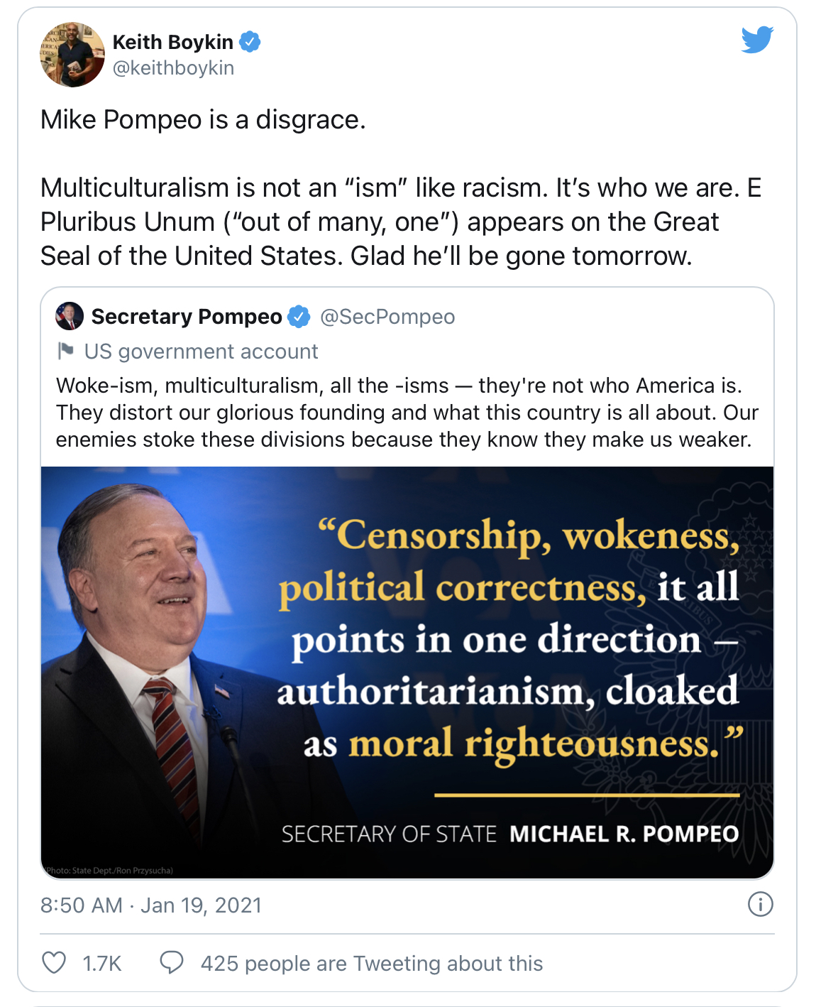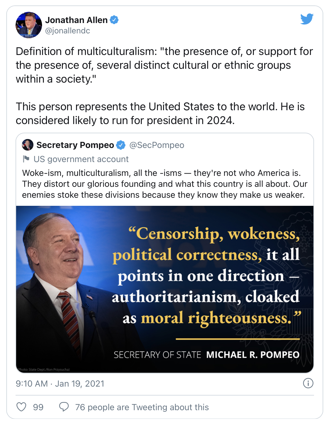 퇴임 직전인 폼페이오 장관의 ‘다문화는 미국이 아니다’는 발언은 차기 바이든 행정부를 향한 비아냥이라는 지적도 있다. 트럼프 행정부 관료중 백인이 아닌 경우는 겨우 8% 내외였다. 그러나 차기 바이든 행정부에서는 백인이 아닌 관료가 40%를 넘을 것이라는 보도가 나오고 있다.
