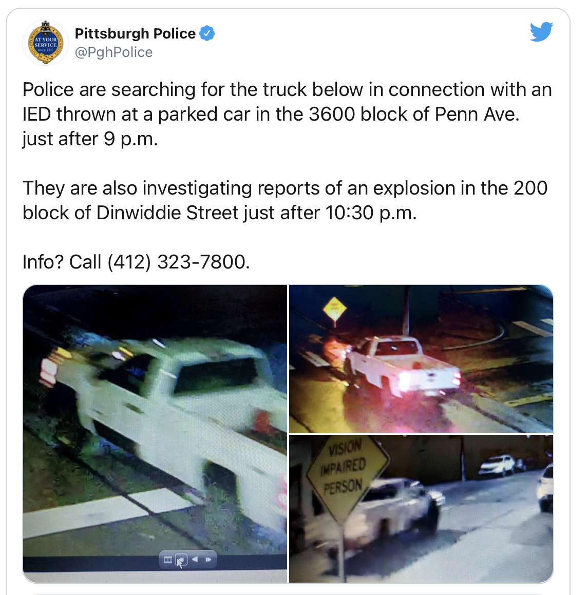 네슈빌 폭발 사건 충격이 채 가시지 않은 상황에서 또다른 폭발 사건이 발생하자 피츠버그 경찰은 모방 범죄 가능성도 열어두고 폐쇄회로 영상 분석을 통해 용의차량인 흰색 픽업트럭을 공개수배했다. 피츠버그 경찰은 용의차량인 흰색 픽업트럭에서 폭발물이 내던져진 것으로 보고 있다