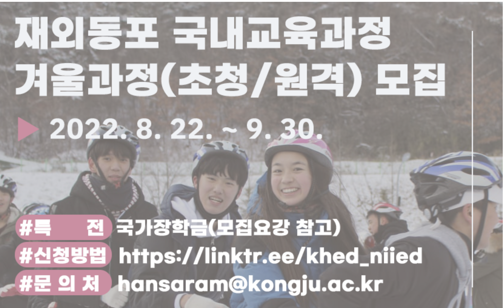 한국 교육부 국립국제교육원이 재외동포 차세대의 한민족 정체성 함양과 국제화 마인드 배양을 위해 ‘재외동포 겨울 국내 교육과정’ 참가자를 모집한다.