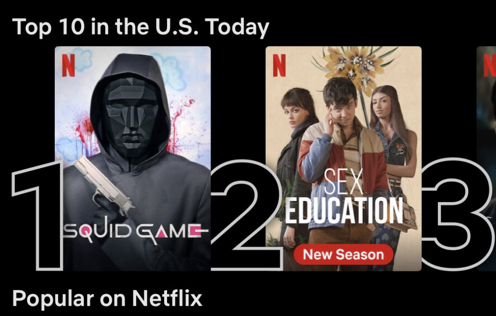 넷플릭스 메인화면에는 넷플릭스 전체 컨텐츠 중에서 ‘오징어게임’이 전체 순위 1위 임을 보여준다. 한국 드라마 중에서 가장 인기있던 작품인 ‘킹덤’을 제친 ‘오징어게임’은 지난 17일 처음 공개된 후 불과 4일 만에 월등랭킹 TV쇼부분 2위에 오르며 화제의 작품이 됐다.