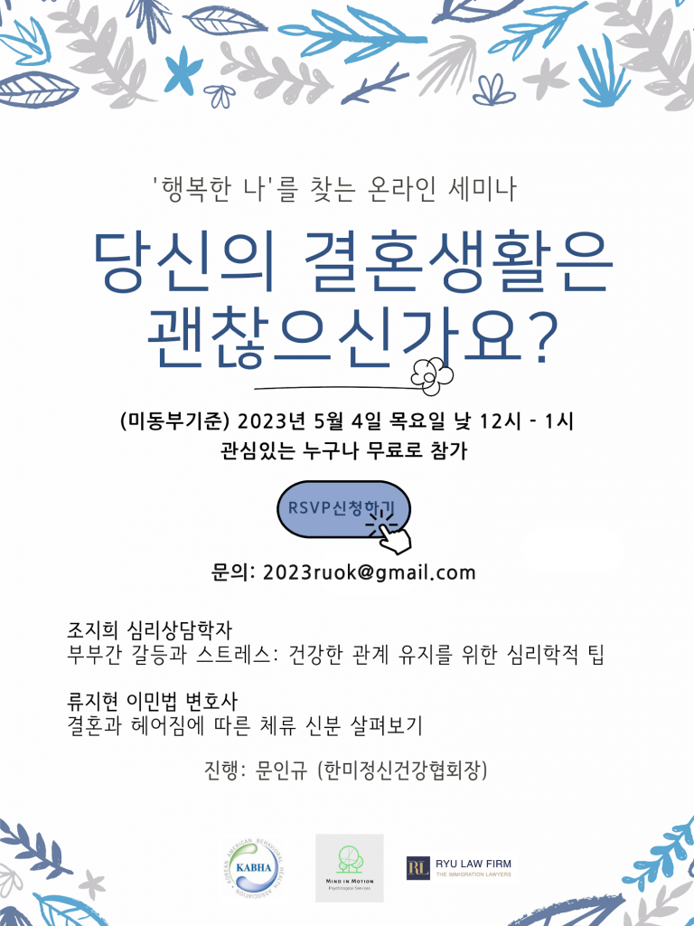 한미정신건강협회는 보도자료에서 오는 5월 4일 낮 12시 ‘당신의 결혼생활은 괜찮으신가요?’ 라는 주제로 심리상담학자 조지희 박사를 초청, 세미나를 개최한다고 밝혔다.