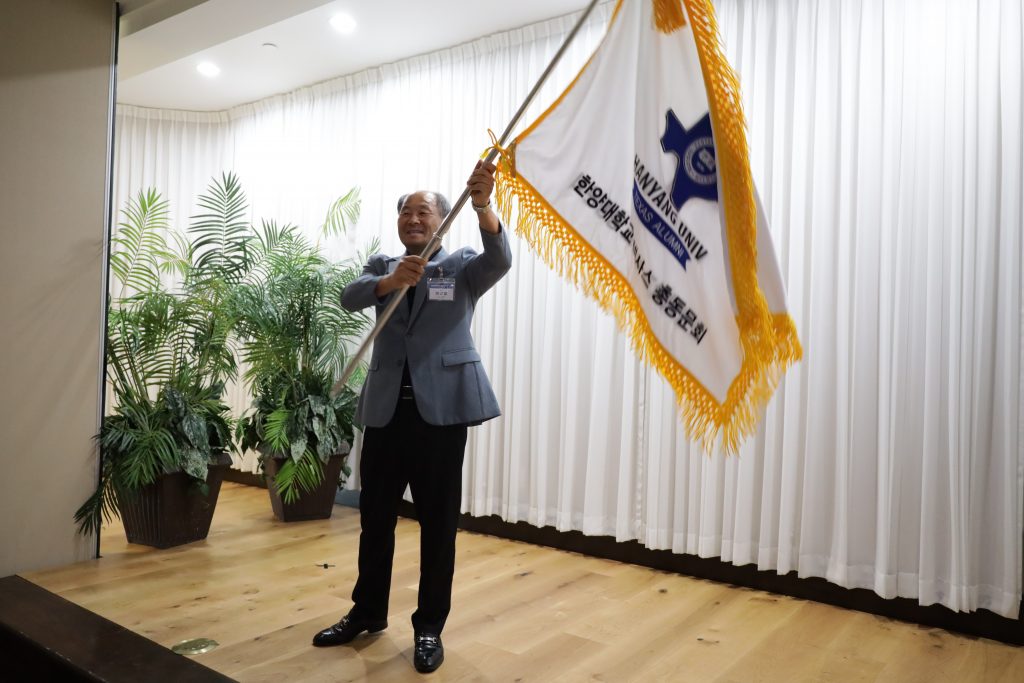 한양대학교 텍사스 총동문회 깃발을 흔드는 이강일 회장