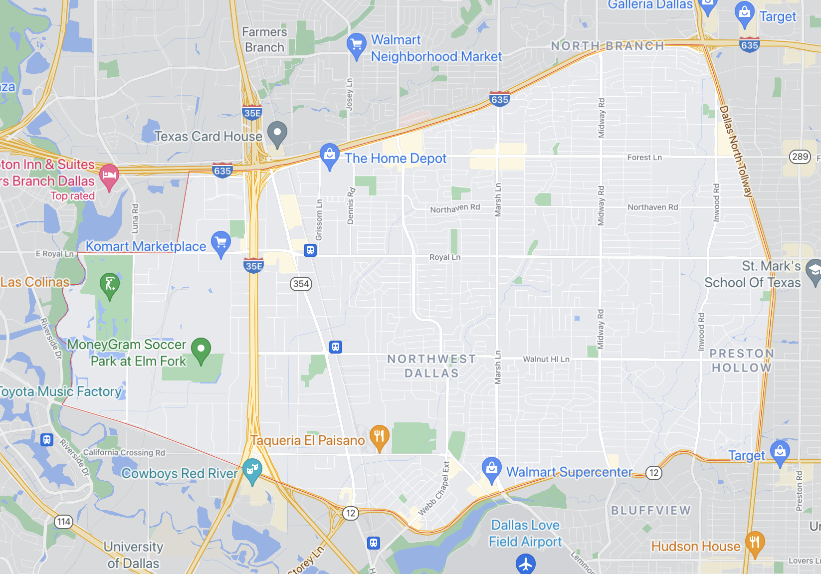 이미지출처 – 구글 맵 – 노스웨스트 달라스는 635번 도로 남쪽, 35번 고속도로 동쪽 달라스 톨웨이 서쪽 지역으로 달라스 한인타운(로얄레인, 헤리하인즈)과도 멀지 않은 곳이다.