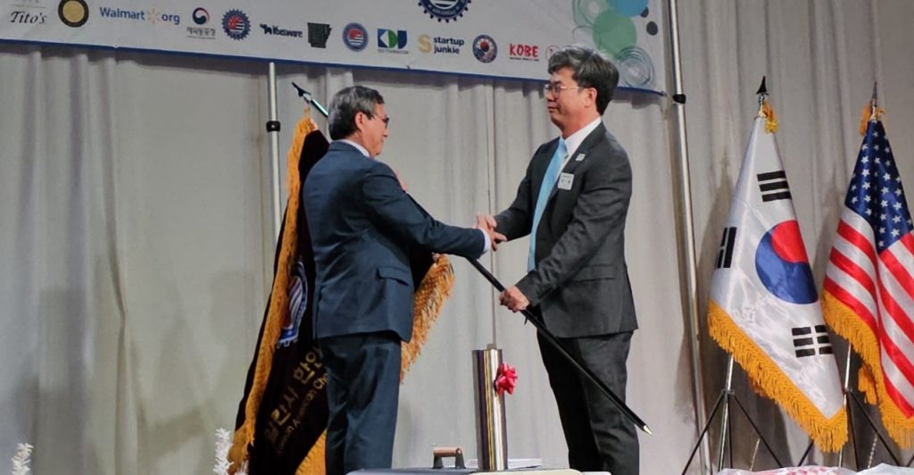 사진/ 알칸사 한인상공회의소 이창헌 회장(사진 오른쪽)이 신임 정영석 회장에게 상공회기를 넘겨주고 있다.