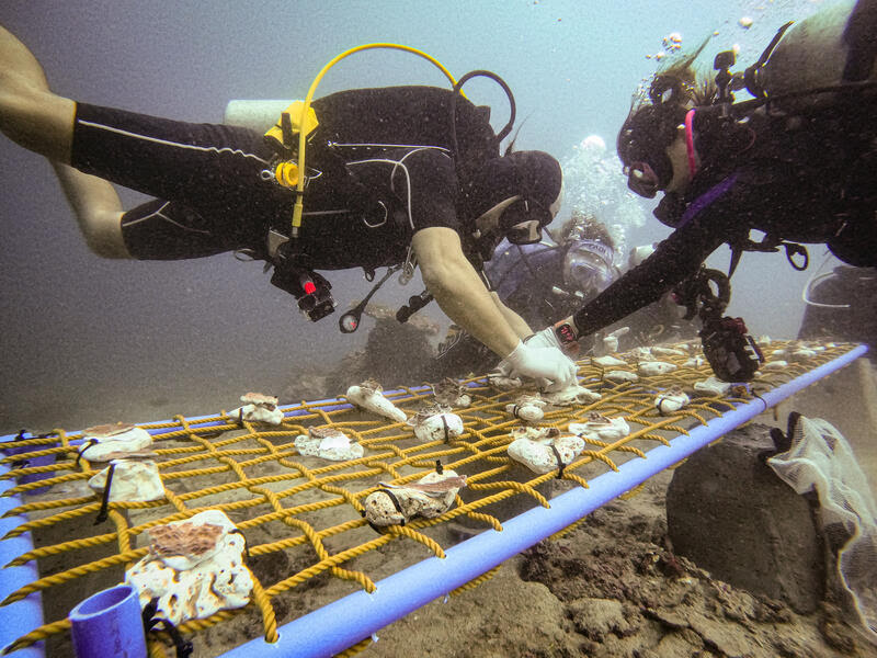 사진/로이터 (Divers tie rescued corals onto coral nurseries in Bauan, Batangas province, Philippines, March 10, 2024. REUTERS/Peter Blaza