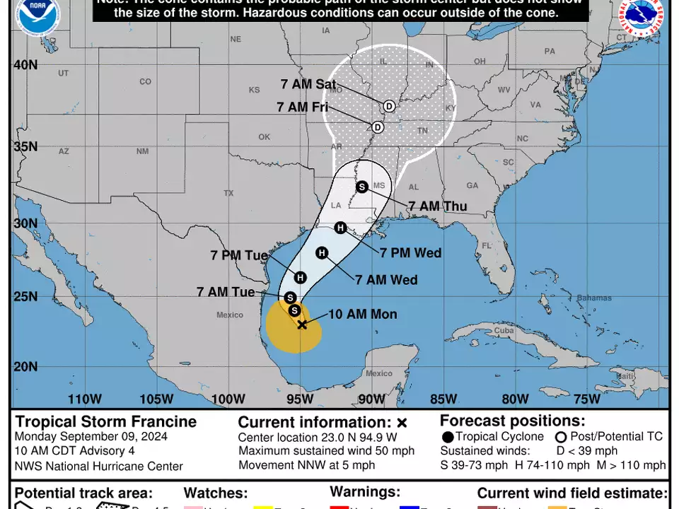 국립 허리케인 센터(National Hurricane Center)에 따르면 멕시코만 서부에서 시작된 프랜신은 브라운스빌에서 남동쪽으로 225마일 떨어진 곳에서 시속 5마일로 북서쪽으로 이동중이다.