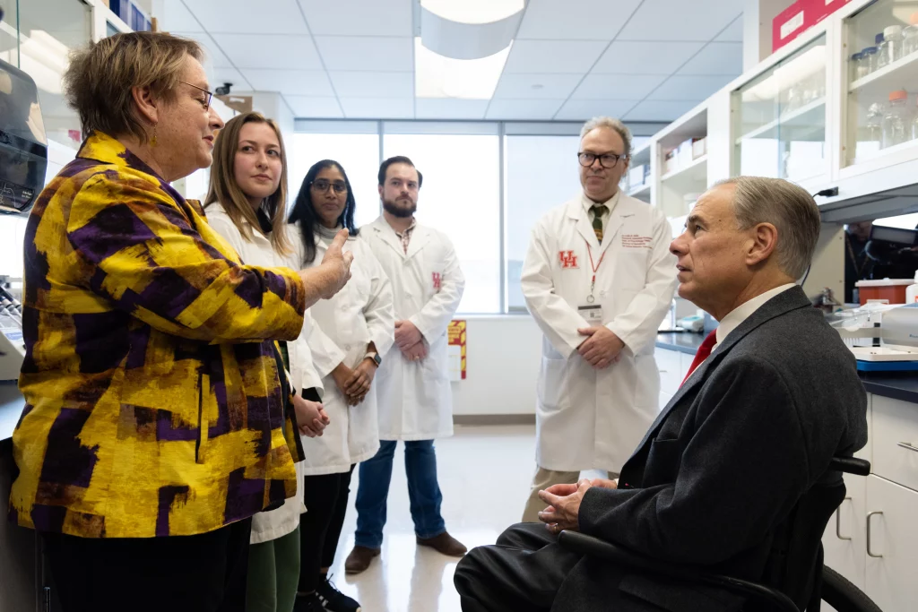 [사진= 휴스턴대학교 홈페이지] 휴스턴대학교 연구진이 그레그 에봇 주지사에게 마약백신 개발과정 및 성과에 대해 설명하고 있다