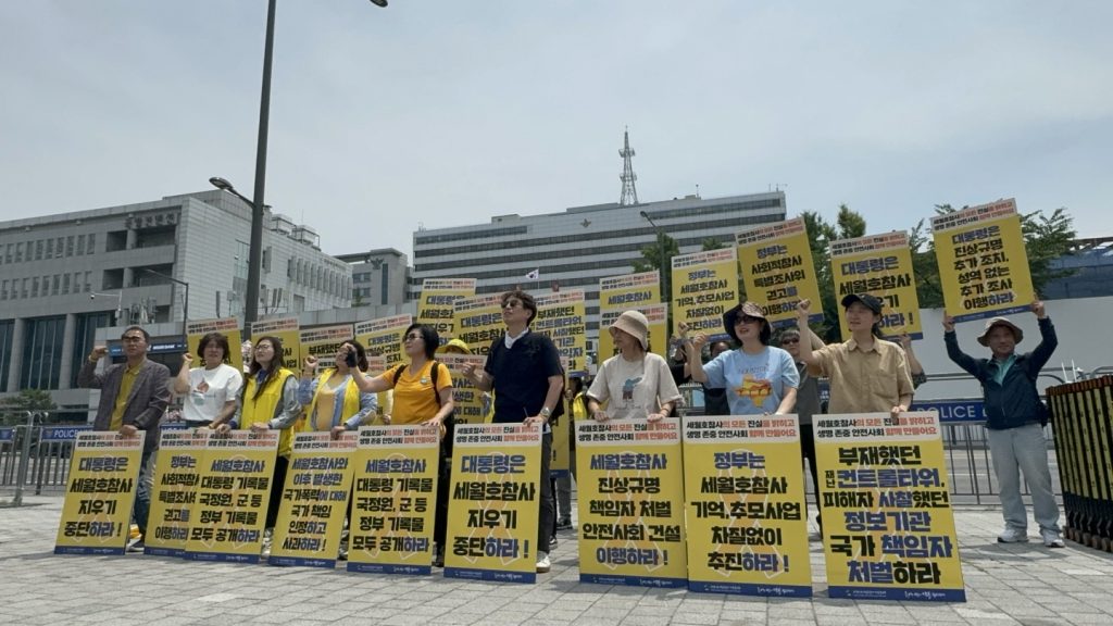 사진/ 함께맞는 비 회원들이 지난 6월 5일 용산 대통령실 앞에서 세월호 참사 지우기를 중단하라는 피켓시위를 열었다.