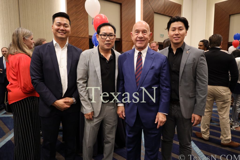 사진/ 존 위트마이어 후보 캠프가 준비한 파티에 휴스턴 한인상공회의소 회장단이 참석, 투표를 마친 지지자들과 함께 위트마이어 후보의 승리를 응원하며 기념사진을 촬영하고 있다. (왼쪽부터 휴스턴한인상공회의소 차세대그룹 이든 리 회장, 휴스턴 한인상공회의소 강문선 회장, 존 위트마이어 휴스턴 시장 후보, 휴스턴 한인상공회의소 스티브 윤 부회장)