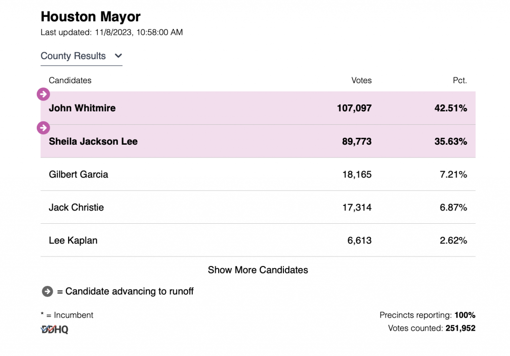 휴스턴 시장선거에서 존 위트마이어 주상원의원과 쉴라 잭슨 리 연방하원의원이 나란히 1와 2위 득표율을 보이면서 내달 9일 열리는 결선에서 맞붙는다.