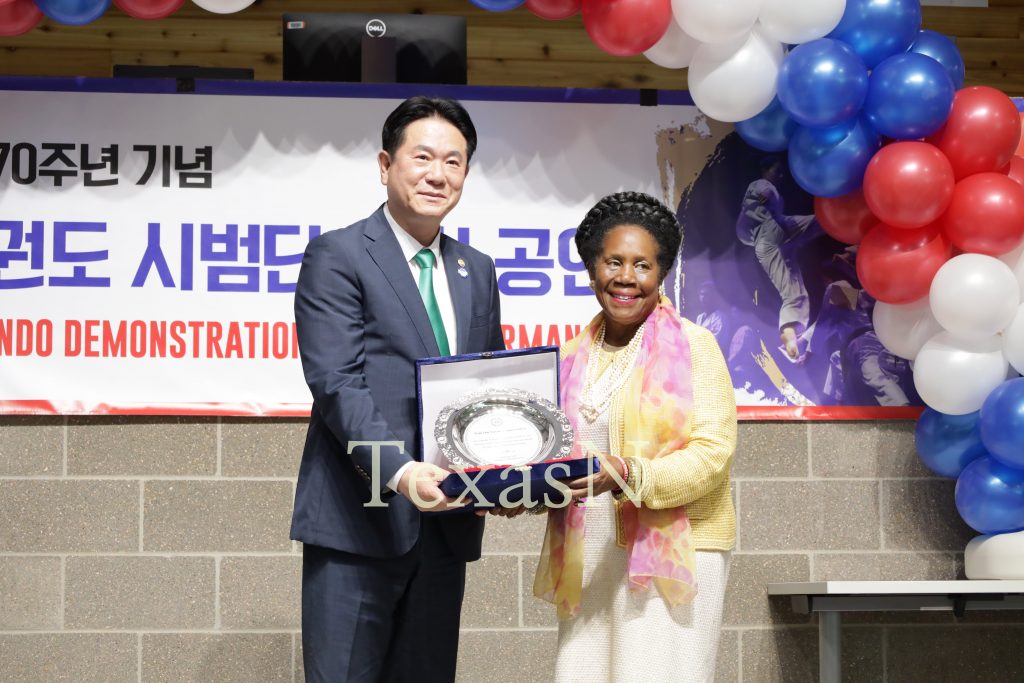 [사진=텍사스N database] 휴스턴에서 열린 국기원 시범단 행사에 참석했던 쉴라 잭슨 리 휴스턴 시장 후보(사진오른쪽)가 이동섭 국기원장(사진왼쪽)으로부터 감사패를 받았다.