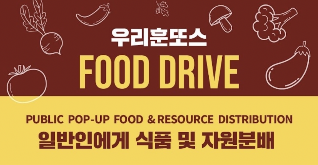 우리훈또스는 오는 28일(금) 오후 1시 30분부터 두시간동안 농산물을 포함한 각종 식품들을 나눌 예정이며 비상 재난키트도 제공할 예정이다.
