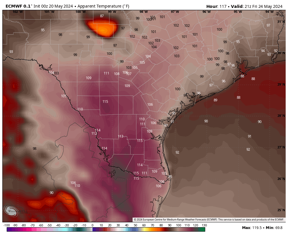 휴스턴의 열지수(습도포함한 체감온도)는 이번주 후반에 화씨 100도(섭씨 38도)에 도달할 것이며 주말에는 화씨 105도(섭씨 40도)까지 올라갈 것으로 예상된다. 또 남부 텍사스 역시 기온이 화씨 105도에서 110도(섭씨 40도에서 43도) 사이로 치솟을 것으로 예보됐으며 멕시코 국경지역은 화씨 113도(섭씨 45도)까지 오를 것으로 보인다.