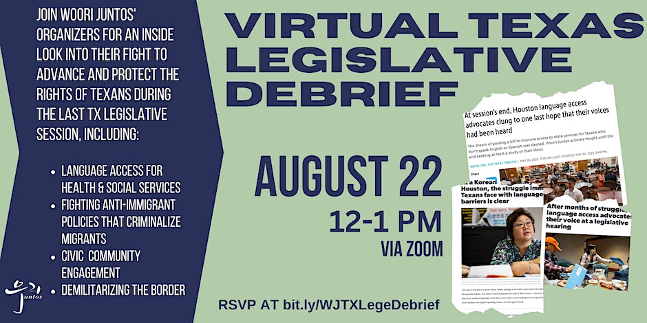 휴스턴에서 활동하는 한인시민단체 우리훈또스(대표 신현자)가 2023년 텍사스 입법회기에 주의회를 향한 다양한 활동 및 비 영어권 텍사스 주민들이 입법 과정 참여를 늘리기 위한 방안에 대해 논의하는 온라인 브리핑을 개최한다.