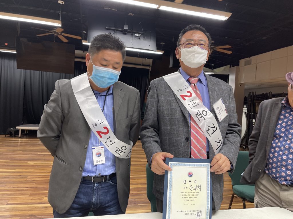 사진/ 휴스턴한인회장 선거 결과 발표 후 기호 2번 윤건치 후보가 당선증을 교부받았다.(TexasN)