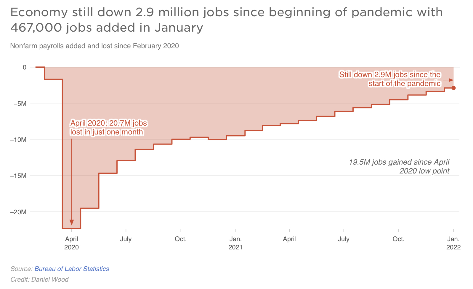 일자리 수 증가와 더불어 시간당 평균 임금도 지난해보다 5.7% 가 오른 반면 주간 노동시간은 34.5시간으로 전년대비 0.2시간 줄어 들었다.  오미크론 확산에도 일자리 수가 크게 능가하자  조 바이든 대통령은 “미국이 다시 일을 하고 있다”면서 “우리나라는 더 강해졌다”고 말했다.