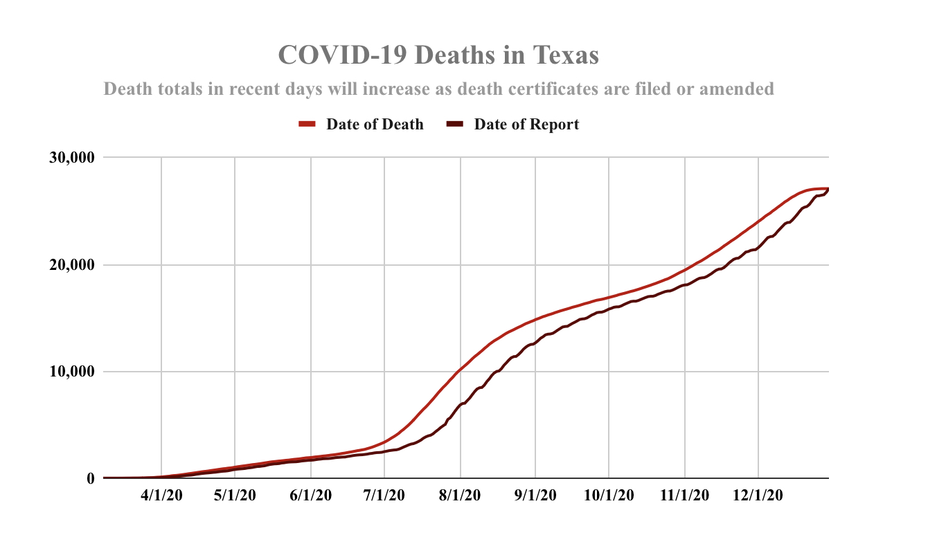 텍사스에서 코로나19 로 인한 첫 사망자는 휴스턴 남쪽 해안가에 위치한 마타고다 카운티(Matagorda County)에서 3월 16일 발생했다. 그리고 9개월 이후 12월 한달에만 총 2만 7,088명이 사망했다. 12월 마지막주에만 하루평균 170명이 사망했다.