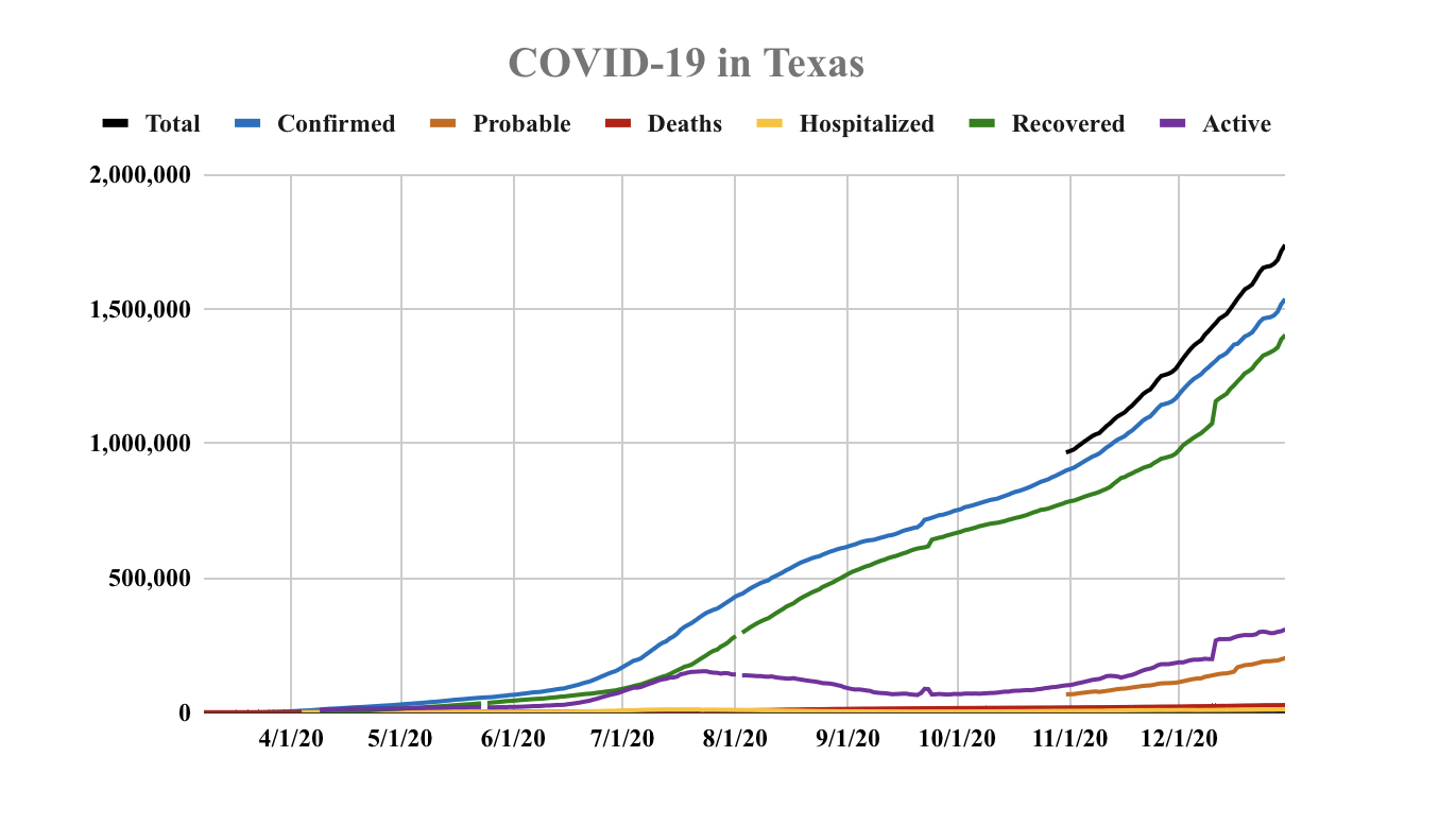 텍사스 휴스턴 남동쪽에 위치한 포트밴드 카운티(Fort Bend County)에서 지난 3월 4일 코로나19 첫 확진자가 발생했다. 당시 텍사스 보건당국은 한명의 확진자와 다른 한명의 의심환자가 발생했다고 보고했다. 그리고 12월 30일 현재 텍사스 전역에서 153만 6,265명의 확진자와 20만 1,182명의 의심환자가 보고됐고 12월 마지막주에만 1만 1,632명의 신규확진자와 2,196명의 의심환자가 보고됐다.