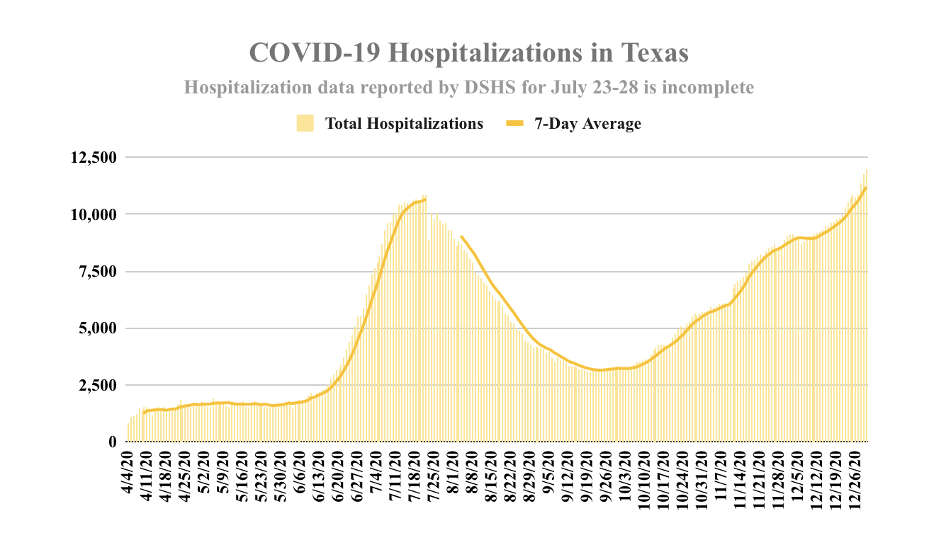 텍사스 보건당국에 따르면 13월 30일 현재 텍사스 전역에서 1만 1,992명이 병원에 입원중으로 병상점유율 최고점을 찍었다.