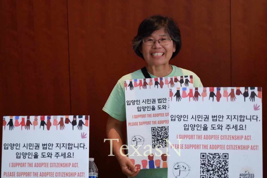 [사진=텍사스N] 휴스턴 민권단체 우리훈또스 신현자 사무총장이 지난 10월 휴스턴에서 ‘한나래’가 주최한 입양인행사에서 입양인시민권법안 지지를 호소하는 팻말을 들고 있다.