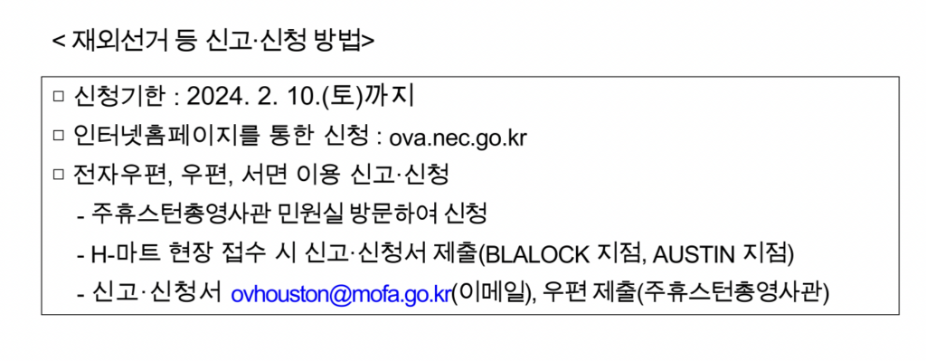 따라서 후보자가 누구인지 먼저 알고 투표를 하겠다고 할 경우 국외부재자 신고신청을 하지 않으면 투표자체를 할 수 없게 된다. 이에 대해 휴스턴총영사관은 “선거에 대한 관심이 고조되는 시기는 재외선거인 등록기한이 끝난 이후”라면서 “재외선거 신고신청을 반드시 해야 한다”고 강조하고 있다.
