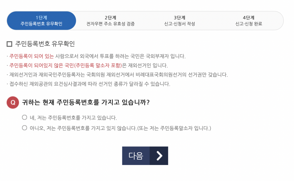 인터넷으로 재외선거 신고신청(신고신청 홈페이지 클릭)할때 첫화면부터 적잖이 당황하는 사람들이 많다. 첫 화면에는 주민등록여부를 묻기 때문이다.