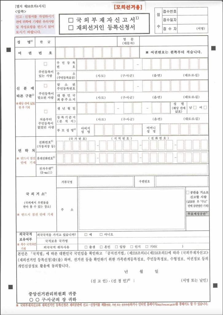 모의투표에 참여하고자 하는 국외 부재자 및 재외선거인은 아래 신청서를 달라스 출장소 홈페이지에서 다운받아 작성후 달라스 출장소 또는 관할 지역 공관에 이메일로 보내면 된다.