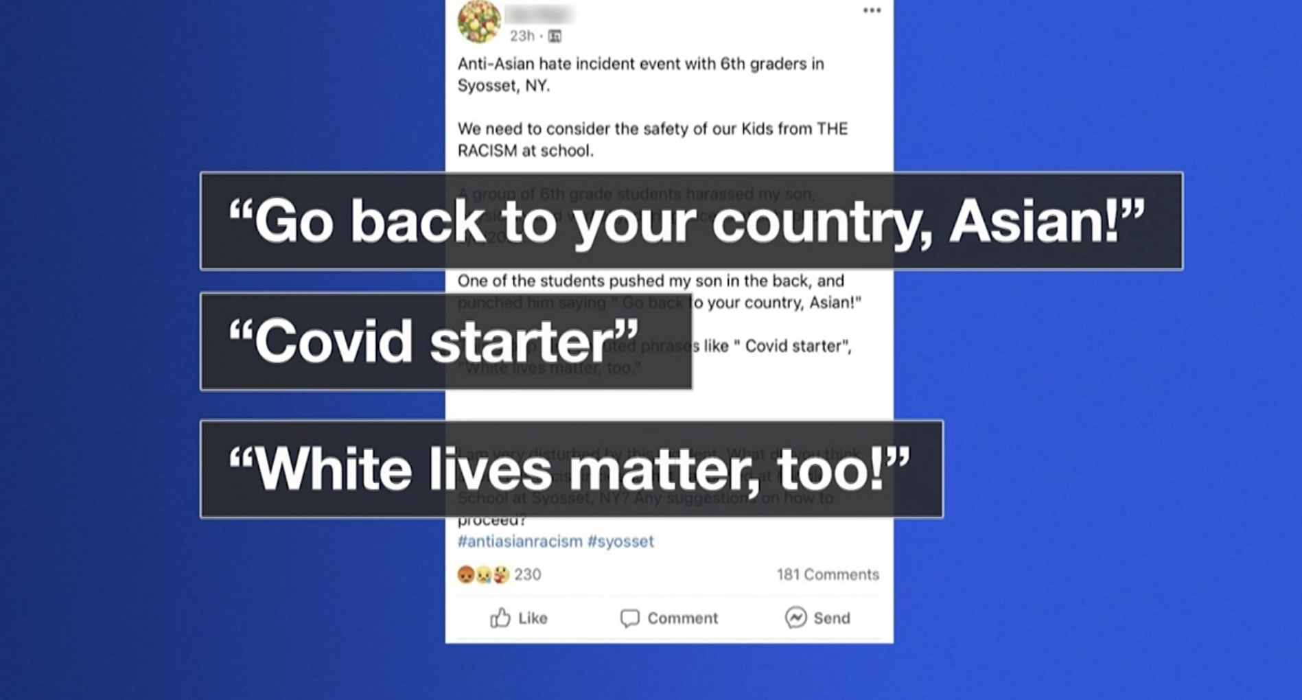 뉴욕주의 사이오셋의 한 중학교에서 6학년인 아시안 학생이 동급생으로부터 “코로나 시발점(Covid Starter)”, “네 나라로 돌아가라” 등의 혐오 발언과 함께 폭행을 당했다.