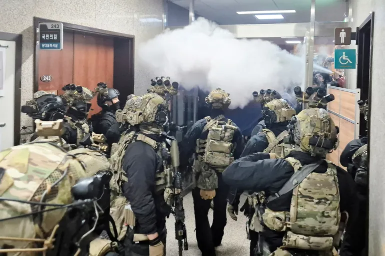 사진/ 로이터(Soldiers advance to the main building of the National Assembly after South Korean President Yoon Suk Yeol declared martial law in Seoul, South Korea, December 3, 2024 [Yonhap via Reuters])