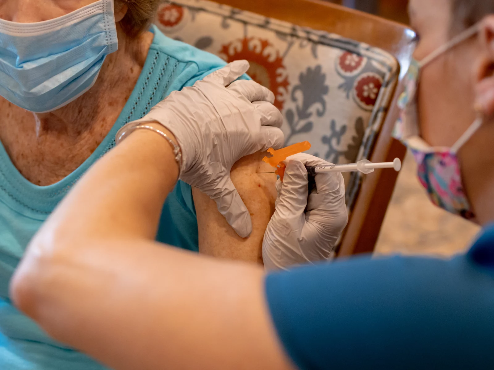 사진/ NPR (A health care worker administers a third dose of the Pfizer-BioNTech COVID-19 vaccine at a senior living facility in Worcester, Pa., in August.)