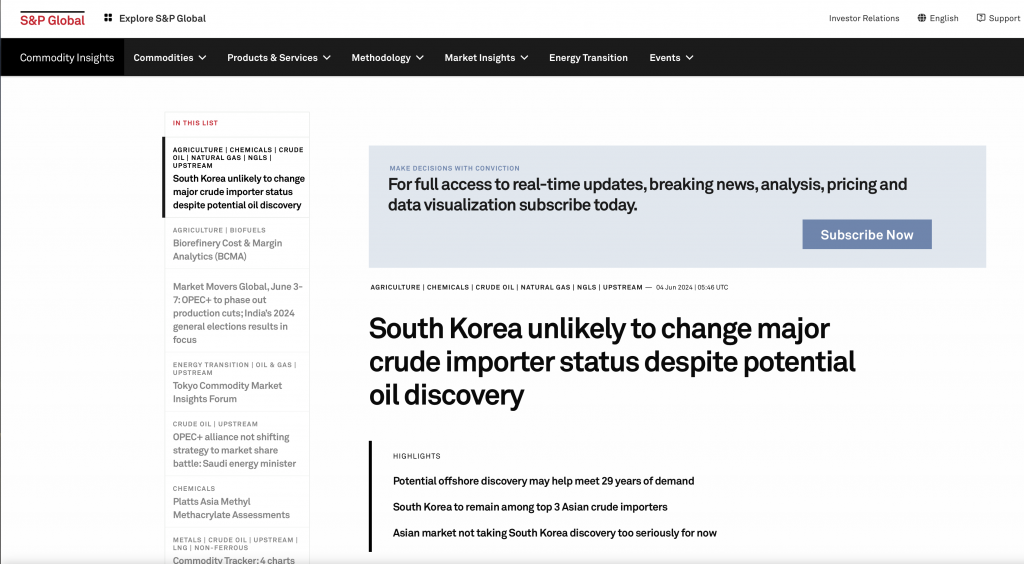 금융정보와 분석, 데이터 제공을 전문으로 하는 다국적 기업인 S&P 글로벌 (S&P Global)이 한국이 석유발견에도 불구하고 주요 원유 수입국 지위를 바꿀것 같지 않다며 아시아 3대 원유 수입국으로 남을 것이라고 분석했다.